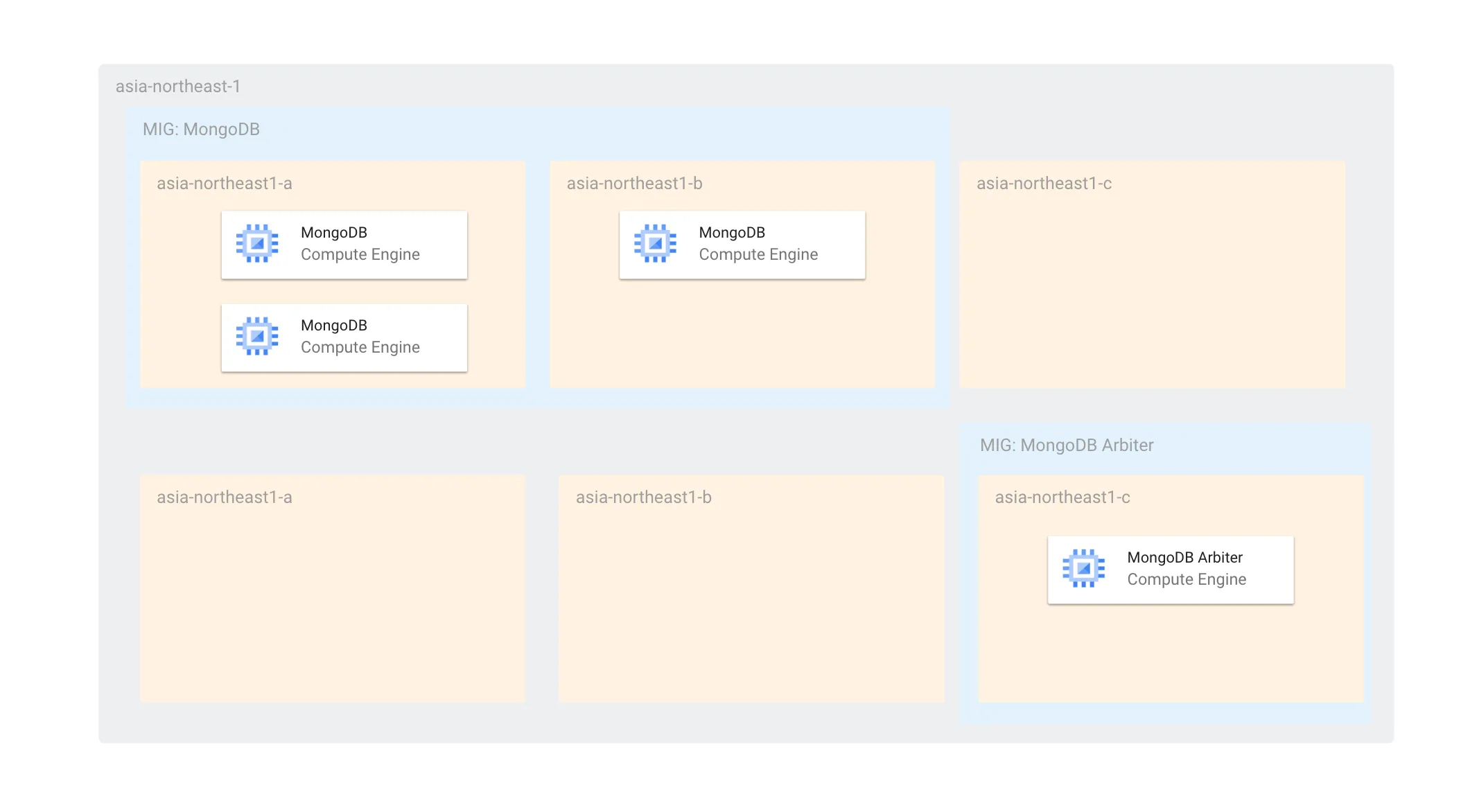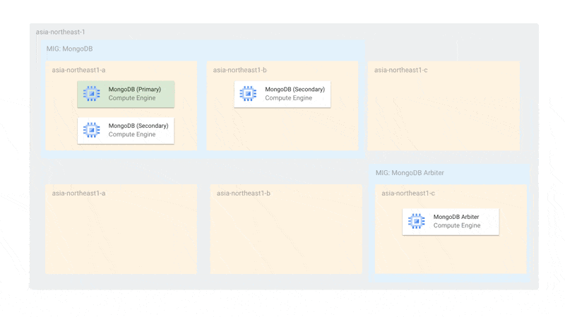 また、単一ゾーン障害に関しても耐えられるようになっています。障害時には、Arbiterと残されたMongoDBでプライマリー選出ができるようになっています。MIGのトポロジーを EVEN にしているため、単一ゾーンにインスタンスが偏らないことが保証されています。