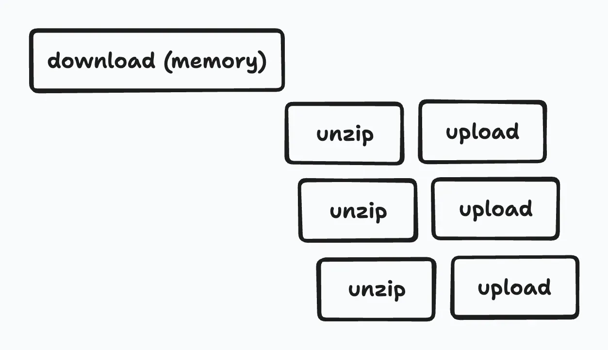 Through this validation, we concluded that a custom parallel upload implementation could indeed significantly improve speed. However, our actual use cases revealed a new challenge: some archive files were so large that their extracted contents exceeded 1TB, necessitating an architectural change.