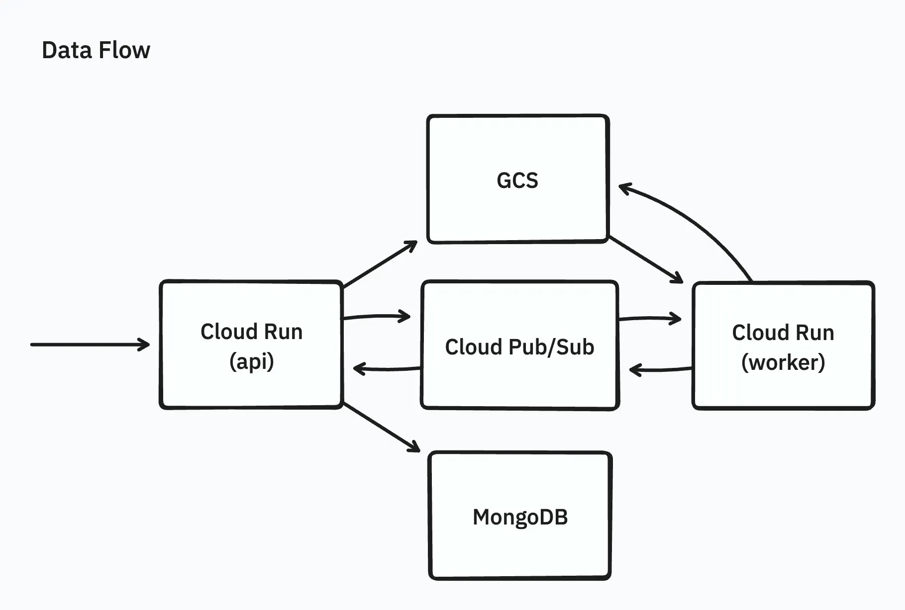 Initially, the implementation was simple: after uploading an archive file from a web browser via an API (running on Cloud Run) to GCS, a worker (also on Cloud Run) would extract the archive file entirely into memory and upload the extracted files to GCS in parallel.